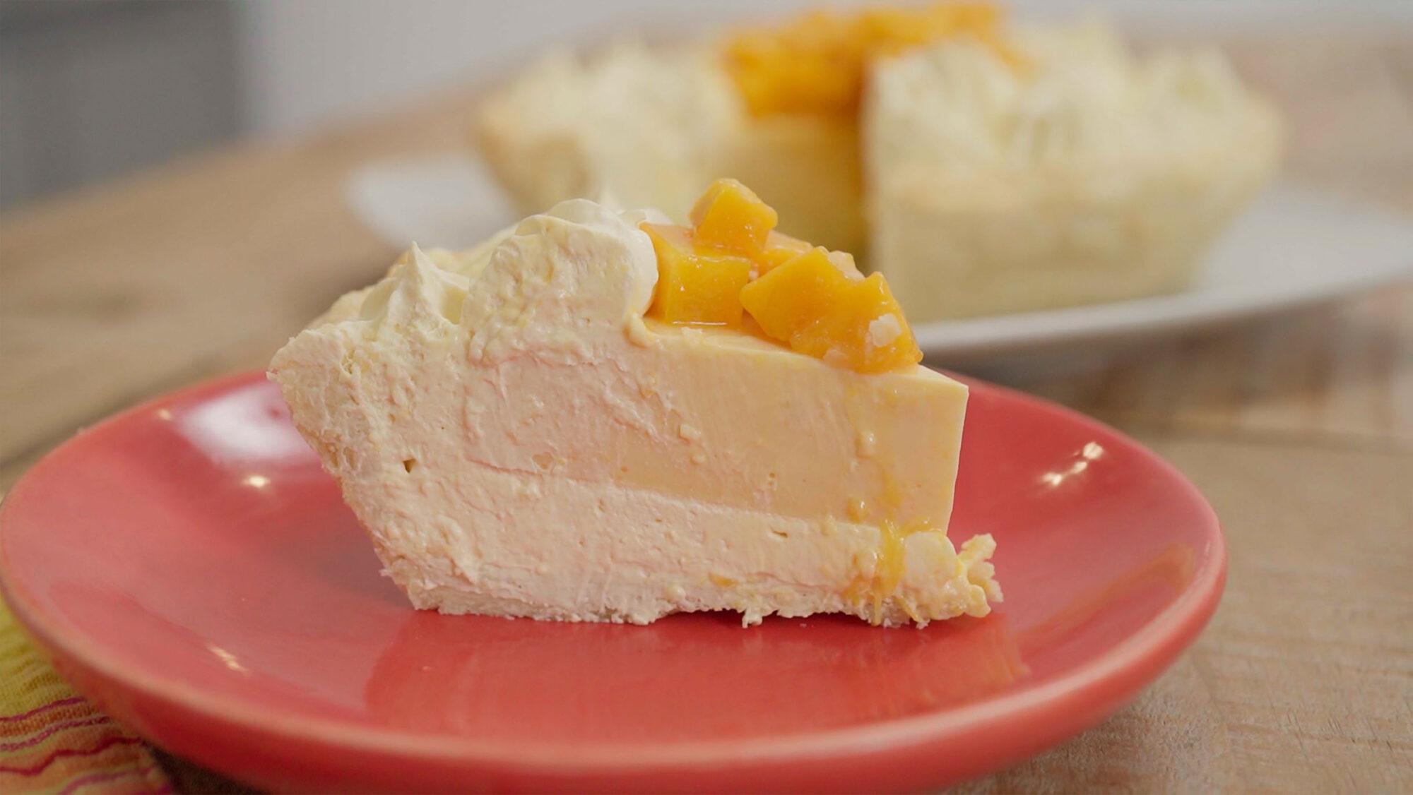 To assemble. Pour or pipe the mango whipping cream into the crust and put the leche flan in the center. Pipe the sides for decoration and add mango cubes on top of the leche flan.
