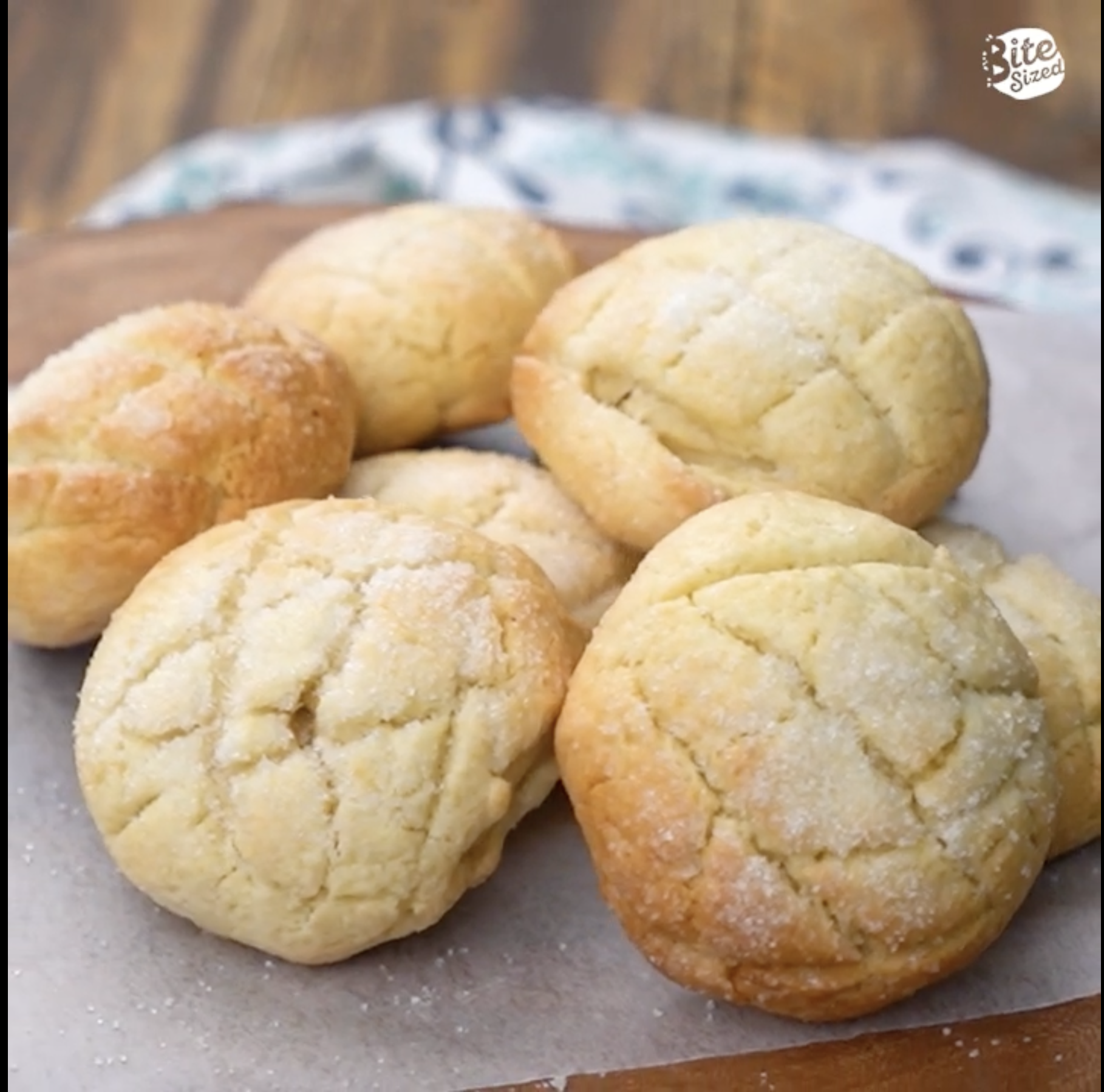 Take out the cookie dough and flatten out each piece into a thin round with plastic wrap. Place the Bread dough in the center and turn it upside down. Cover the bread dough with the cookie dough. Put sugar on the surface and lightly score the dough. Cover with wet cloth and leave in a warm place for about 20 minutes.