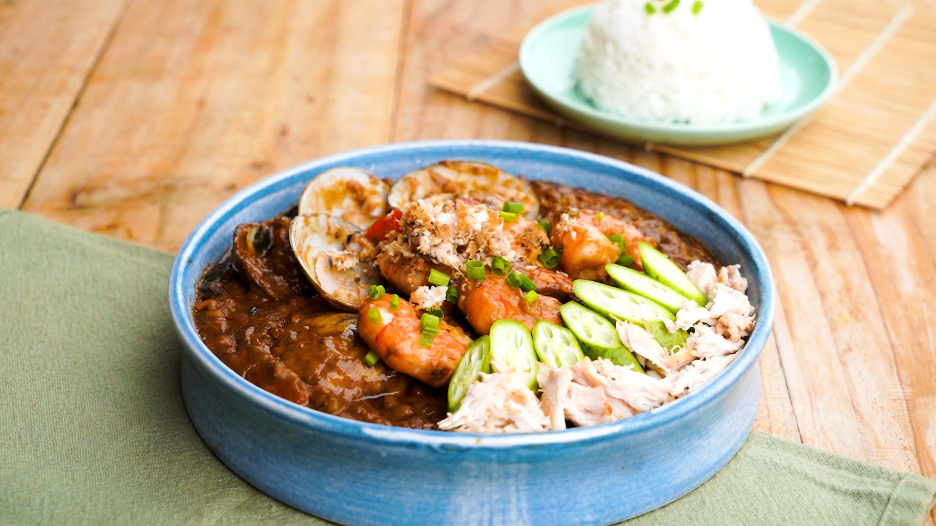 Add the chicken, shrimps, and clams. Add in the sili leaves for five minutes before turning off the heat.