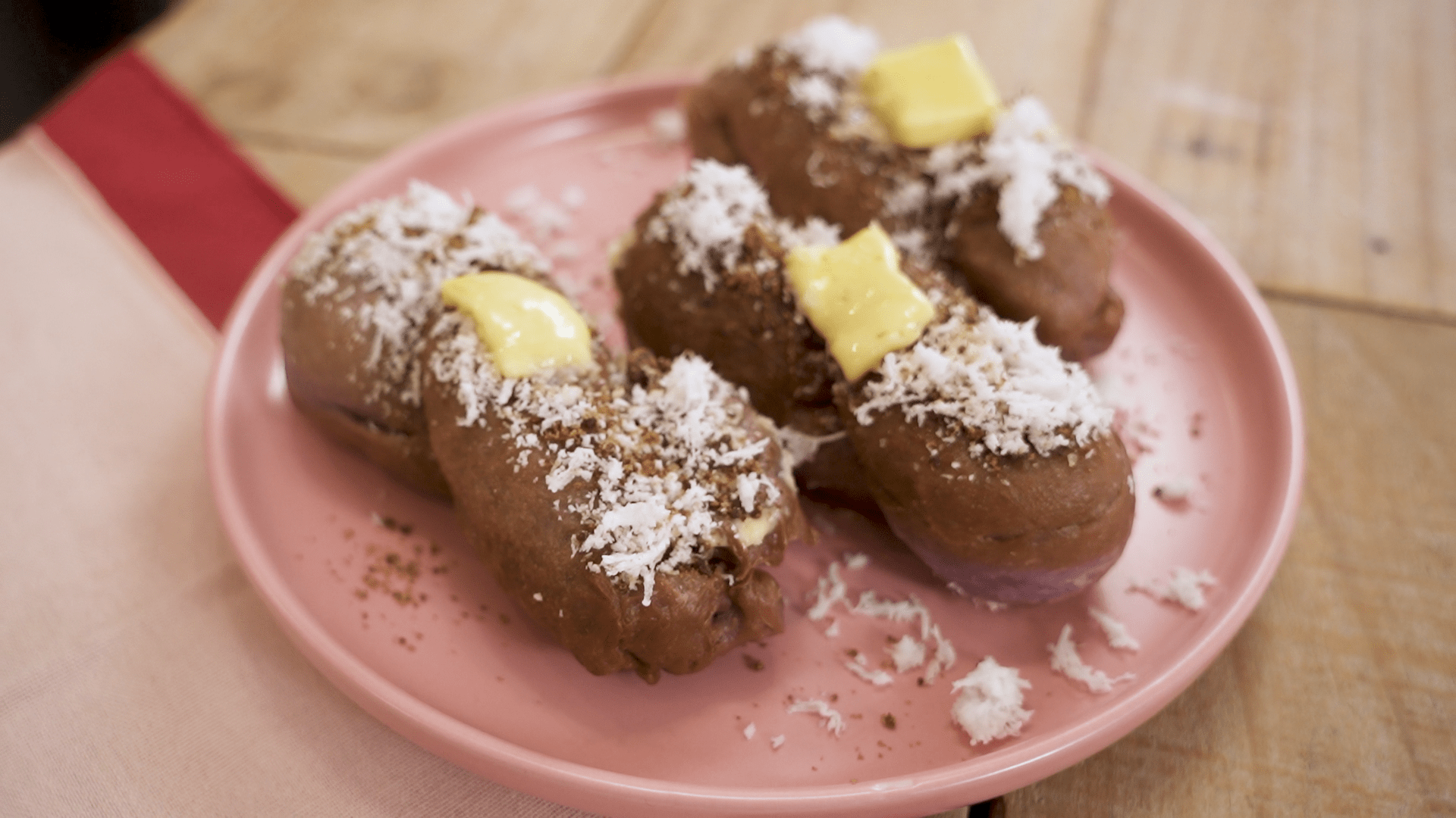To finish, coat the bicho-bicho with melted butter and add the niyog and brown sugar on top. Serve warm.