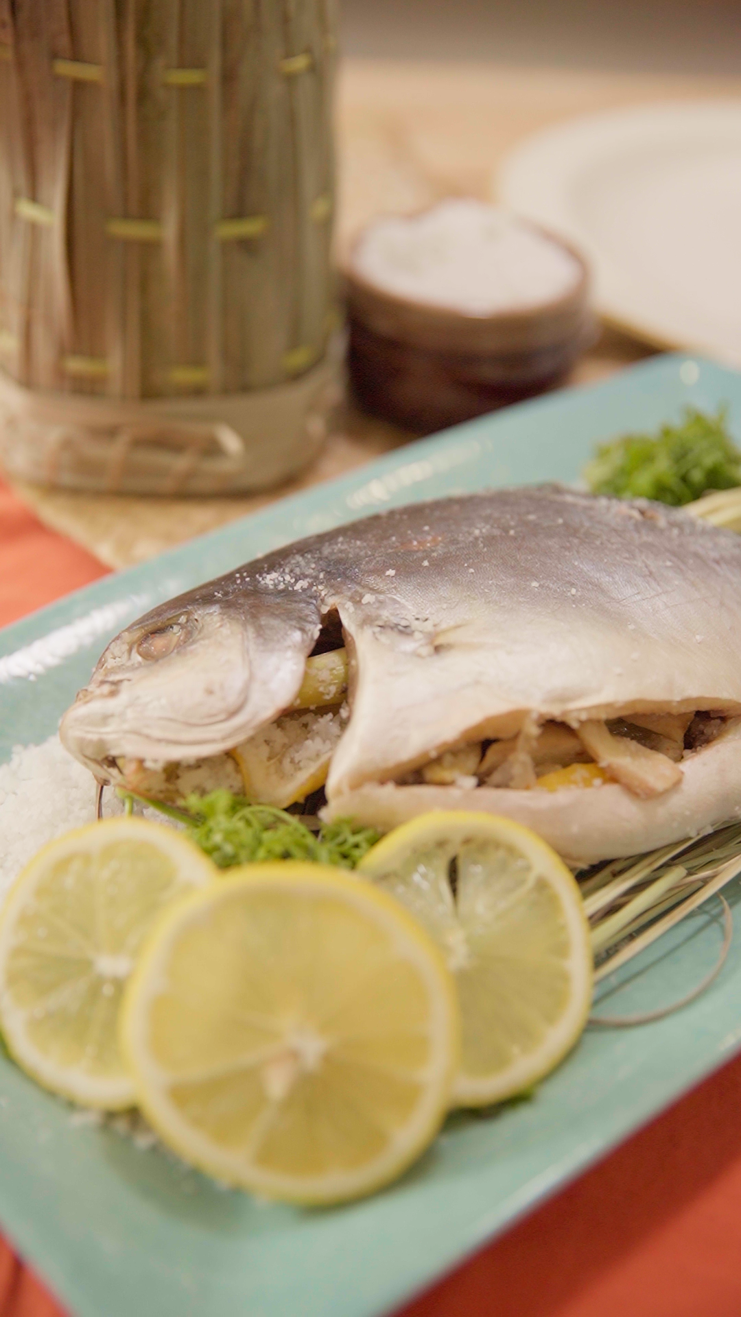 Stuff the pompano with tanglag, lemon, garlic and ginger.