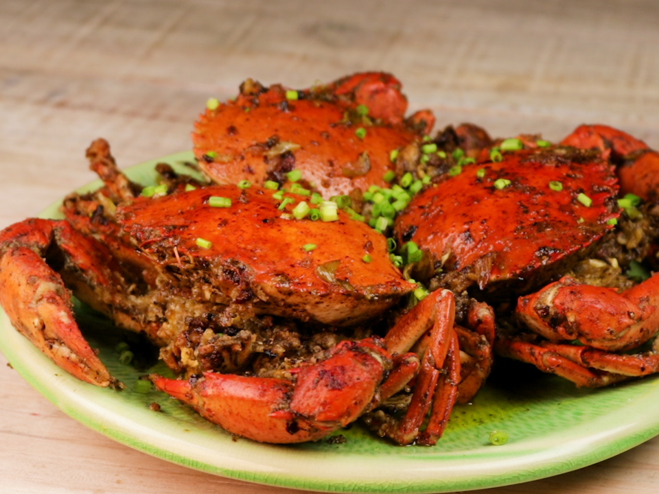 Add the crabs and saute. Mix in the rice wine while sauteeing the crabs.