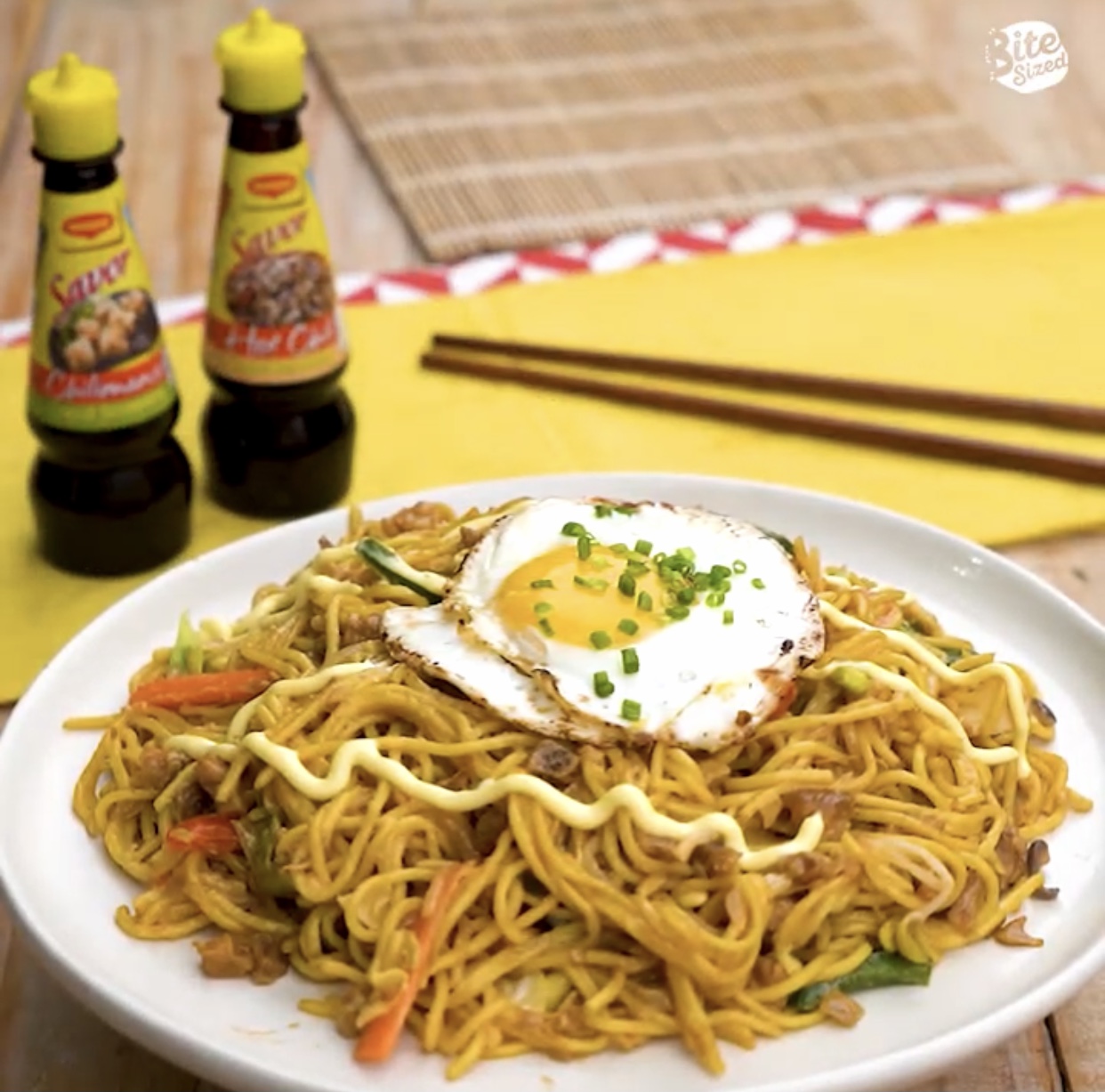 Add tonkatsu sauce and MAGGI Savor Hot Chili. Mix and toss the yakisoba, making sure everything evenly distributed is coated well in the sauce.