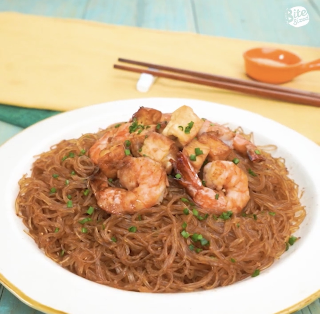 Season with oyster sauce and sesame oil then mix well until shrimps and tofu are well coated with the sauce. When done serve on top of the glass noodles. Sprinkle with toasted sesame seeds then serve immediately.