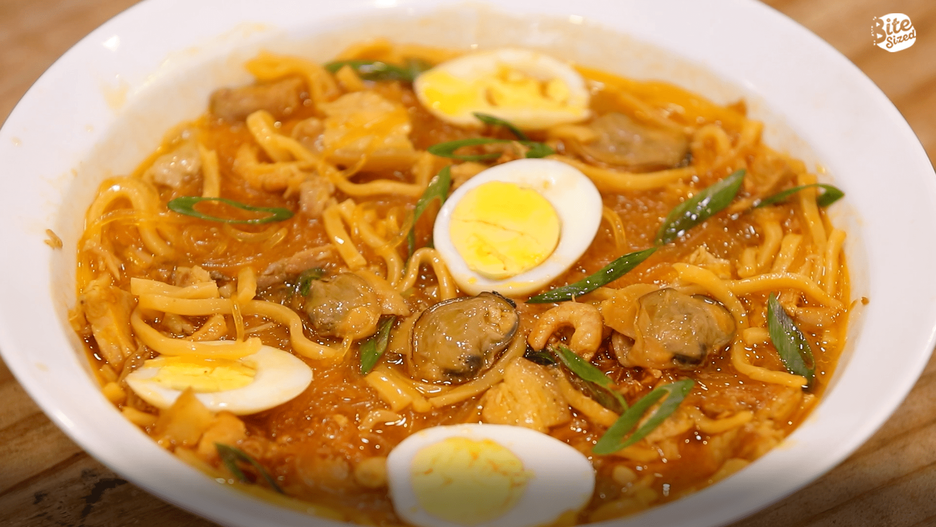 Garnish each serving with hard-boiled eggs, fried garlic, and chopped leeks (green parts). Serve hot.