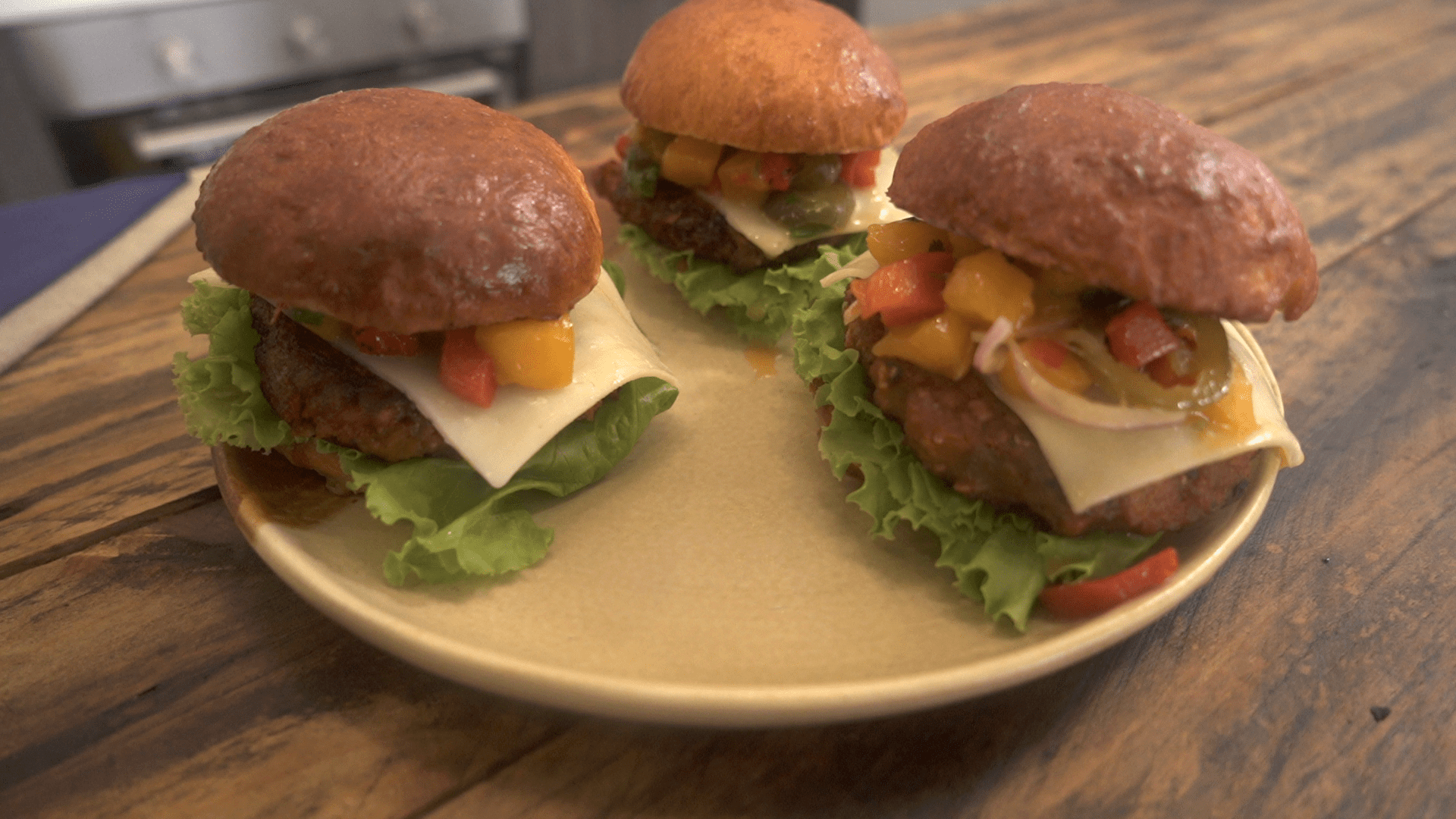 Place curly leaf lettuce on top of a toasted burger bun. Next, add the burger patty then some slices of queso de bola. Finally a spoonful of the mango salsa then top with the top burger bun. Serve immediately.