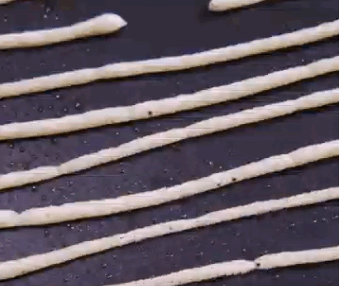 Prepare a non-stick pan over low heat. Squeeze the batter over the pan, making long strands, and let it cook, about 2-3 minutes. Remove the cooked pancake strands and pile them up on a serving plate.