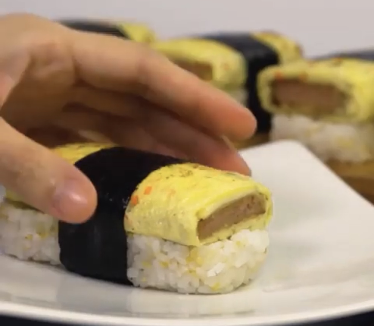 Shape cooked sushi rice into the can of SPAM® Classic with 1-inch thickness and top with the SPAM® cheesy torta. Place on top of the halved nori sheet.