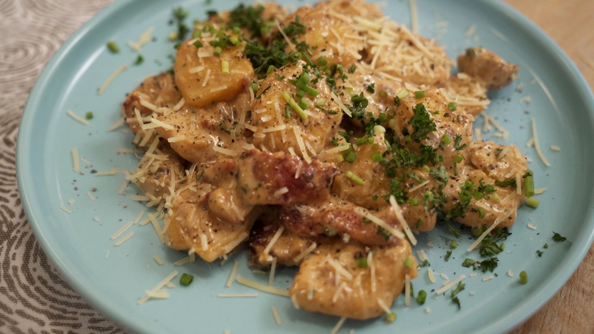 An enjoyable Squash Gnocchi with a succulent Tocino and Mushroom sauce.