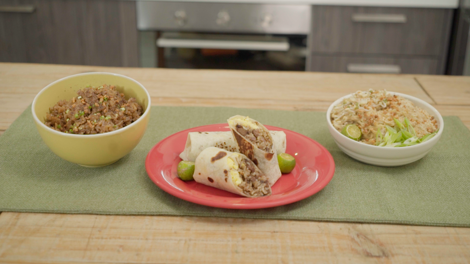 Toast the tortilla. One toasted top with the sisig rice and scrambled egg. Roll the burrito the cut into half. Serve with calamansi and hot sauce