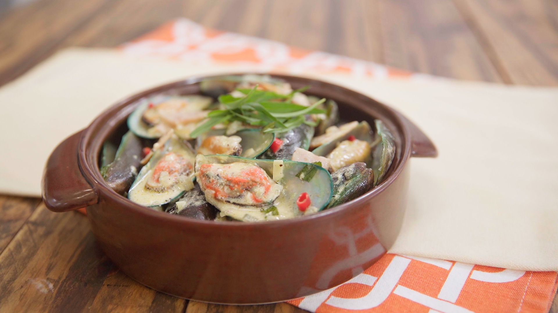 Add the mussels and the curry powder. Cover the casserole and cook the mussels for three minutes.