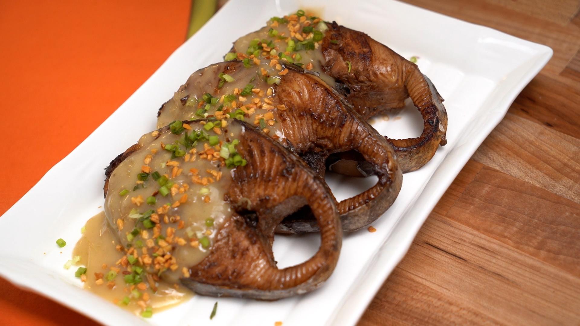 Drizzle the sauce on top of the Tanigue steak then garnish with spring onions and fried garlic.