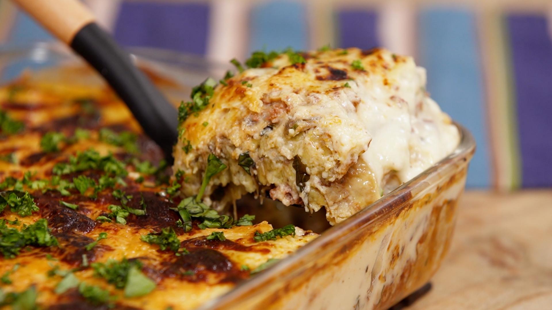 Lasagna made with layers of delicious meat sauce, creamy béchamel and appetizing tortang talong!