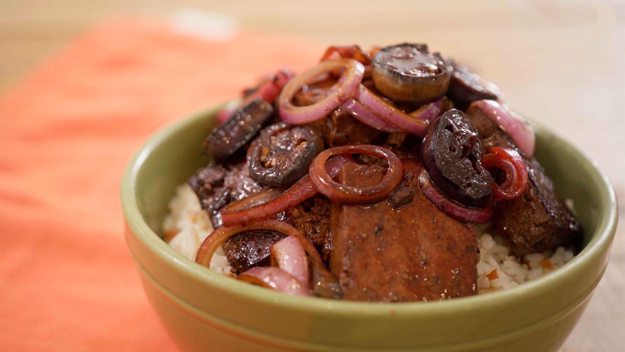 Place back in the pan the eggplant and tofu then add the marinade and red onions. Cook for another 30 secs.