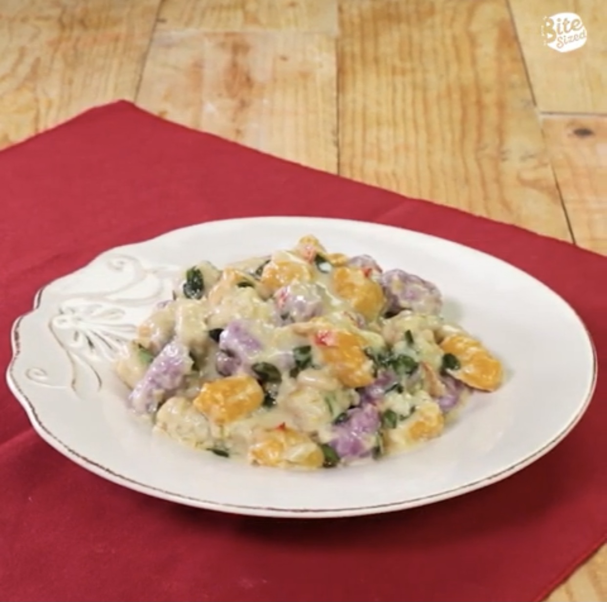 Add gnocchi and cook for a few minutes. Toss in malunggay leaves and simmer for another minute.