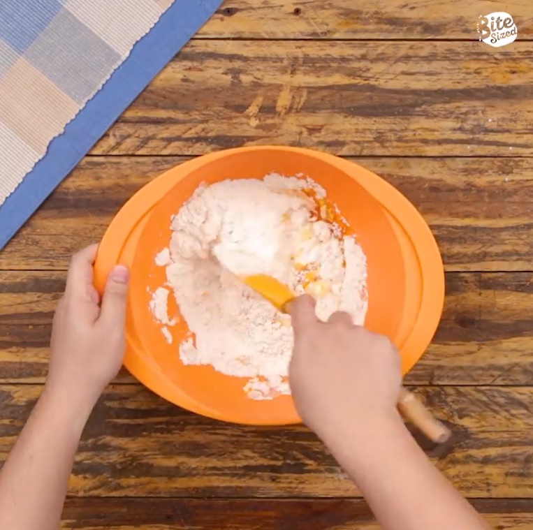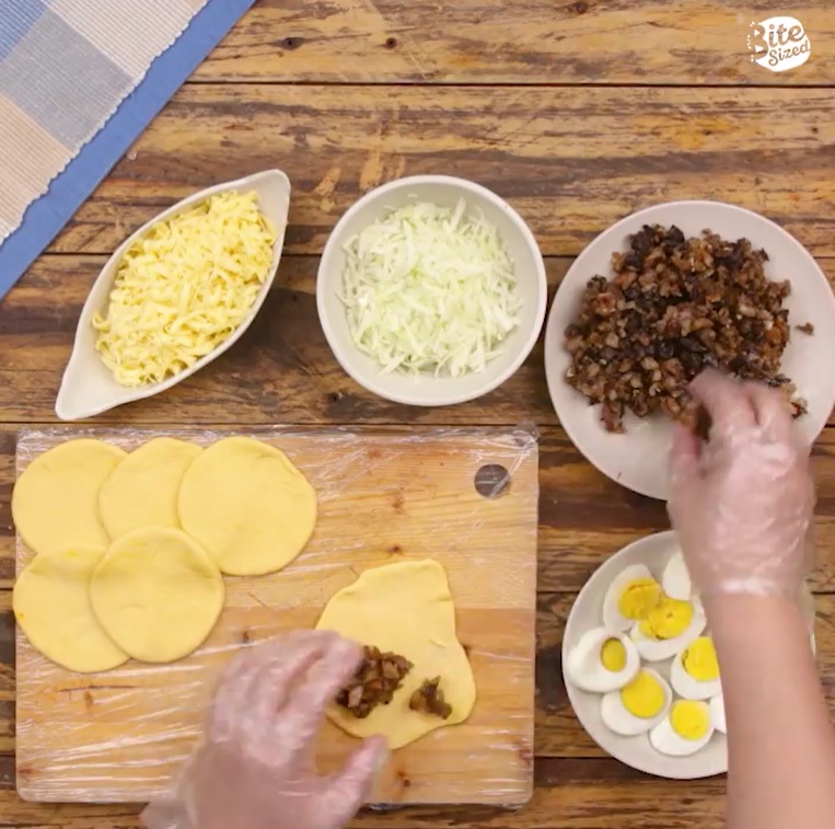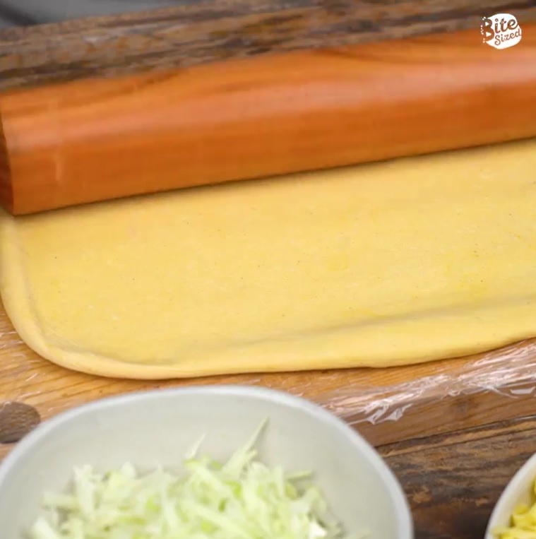 Place about 1/8 cup of dough onto a chopping board wrapped in plastic. Top with another plastic wrap and flatten.
