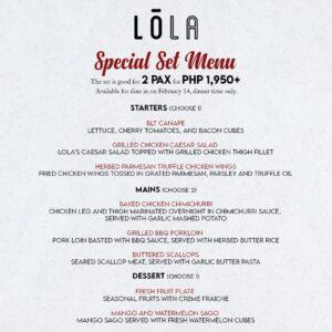 Lola’s always looking out for your love life. This is the reason why they created a special set dinner menu just for Valentine’s Day. Enjoy a three-course meal of your own choice, which includes a starter, two mains, and a dessert. The offer is available in all Lola branches and there are two dinner seating schedules available: 7:00pm and 9:30pm. Whichever you choose, they’ll make your dinner goes romantically well.