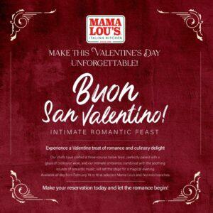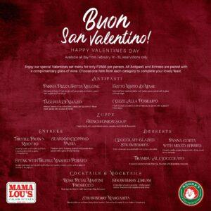 A Valentine’s Dinner for two at Mama’s Lou’s or its sister restaurant, Nonna’s will include a special 4-course new limited-time offer dishes with complimentary wine and an exclusive table set-up for 2. With a theme of Buon San Valentino, enjoy antipasti and entrees, and even cocktails/mocktails to set you and your date in the mood for love. If you dreading the traffic on the 14th you can still avail of this offering until the 16th of February.